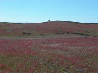 Important habitat for bustards; here the grasslands are dominated by the red flowers of the tiny dock, Rumex bucephalophorus